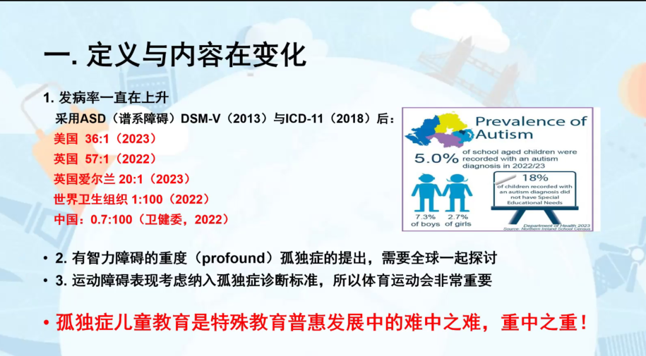 論壇最后,徐云教授作《孤獨(dú)癥兒童教育教學(xué)的國(guó)際新動(dòng)態(tài)及對(duì)我國(guó)的啟示》專題講座。他指出,孤獨(dú)癥譜系障礙的發(fā)病率一直在上升,孤獨(dú)癥兒童教育是特殊教育普惠發(fā)展中的難中之難,重中之重!世界各國(guó)均重視孤獨(dú)癥教育,紛紛出臺(tái)相應(yīng)教育指南。立足中國(guó)特色,要注意本土文化語(yǔ)言體系的表述,遵循兒童身心特征,堅(jiān)持“育人為本”,將心理學(xué)的“知、情、意、行、群”與我國(guó)的“德智體美勞”五育并舉課程體系有機(jī)對(duì)接。徐云教授針對(duì)孤獨(dú)癥兒童的“教學(xué)內(nèi)容”“教學(xué)方法”以及“面臨的挑戰(zhàn)”給予針對(duì)性講解。他強(qiáng)調(diào),孤獨(dú)癥兒童不是學(xué)不會(huì),而是沒有機(jī)會(huì);不是無潛能,而是沒有被發(fā)現(xiàn)。給予適宜、個(gè)性的支持,孤獨(dú)癥兒童完全有可能對(duì)社會(huì)發(fā)展作出巨大貢獻(xiàn)!