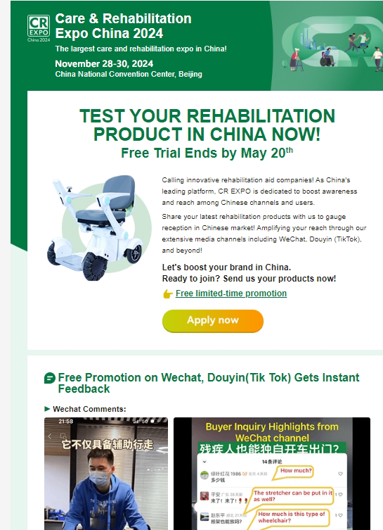 目前CR福祉博覽會(huì)在海外推廣上全力出擊,通過海外社媒、線上精準(zhǔn)營(yíng)銷、EDM營(yíng)銷、海外展會(huì)等多渠道推廣,將更多國(guó)際買家“引進(jìn)來”,推動(dòng)更多展商“走出去”!