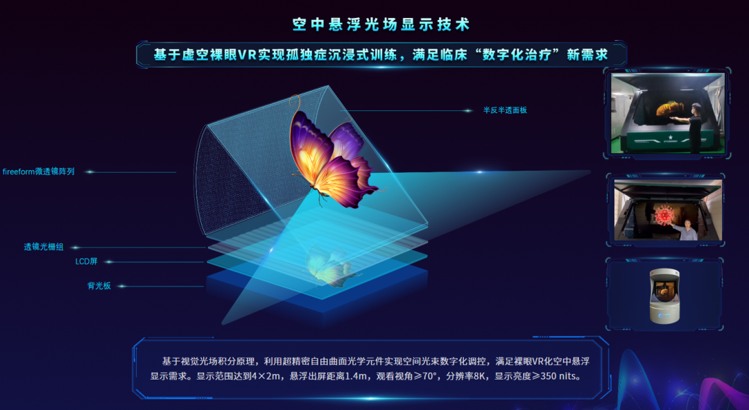 基于視覺光場積分原理,利用超精密自由曲面光學元件實現(xiàn)空間光束數(shù)字化調控,滿足裸眼VR化空中懸浮顯示需求。最大顯示范圍達到4×2m,最大懸浮出屏距離1.4m,觀看視角≥70°,顯示亮度≥350 nits。系統(tǒng)可通過采集用戶語音、姿態(tài)、手勢、眼神、面部表情等多模態(tài)行為學特征實現(xiàn)沉浸式、非接觸的隔空人機交互訓練,滿足臨床“數(shù)字化治療”新需求。為當前國內最大顯示范圍、出屏距離裸眼VR系統(tǒng)。