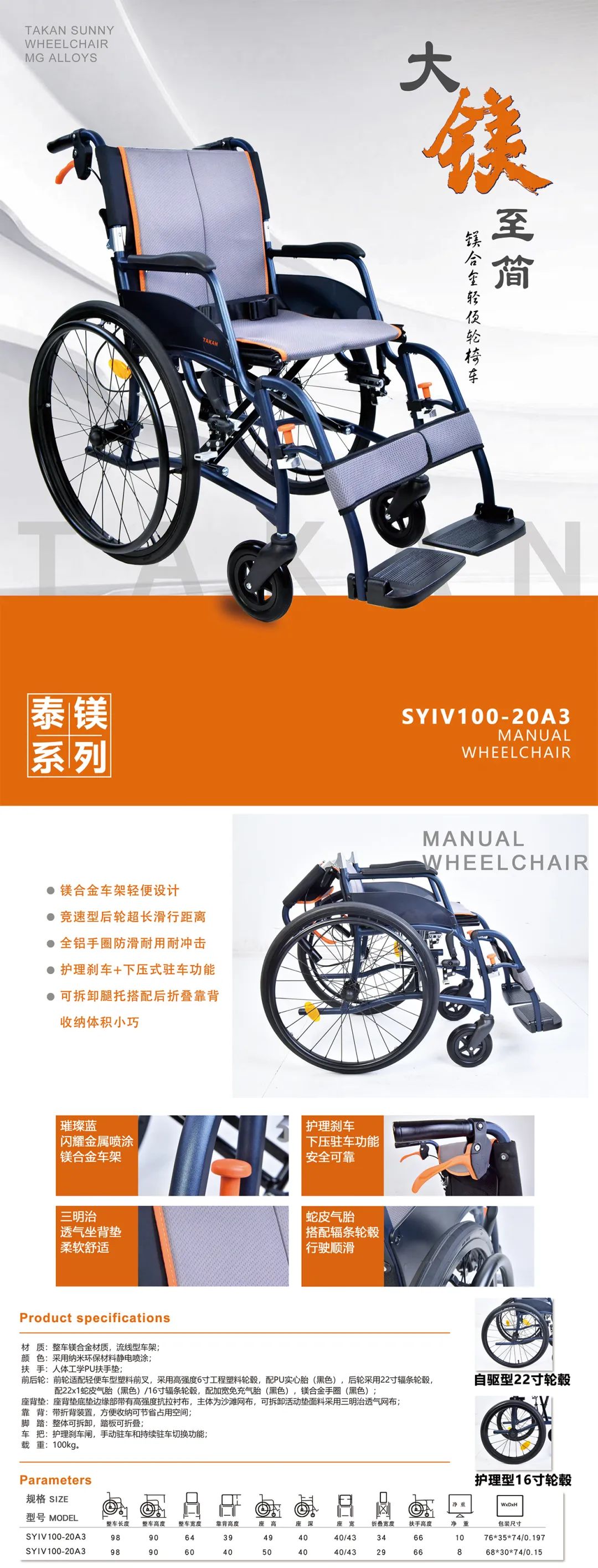 整車鋁合金車架,工字鋼直徑=25mm,壁厚=2.5mm;腳踏板可翻起;坐寬38,40,43可選;后輪24寸氣胎,能有效減震,使用舒適。通過按壓輪圈中間按鈕,可輕松拆卸輪胎,方便外出攜帶;車架可快速折疊,占用空間小。特設(shè)加強(qiáng)型低位護(hù)板,給上肢更大的活動空間,方便上下輪椅。坐墊采用加厚海綿,透氣網(wǎng)格布料,讓乘客舒適、安心。