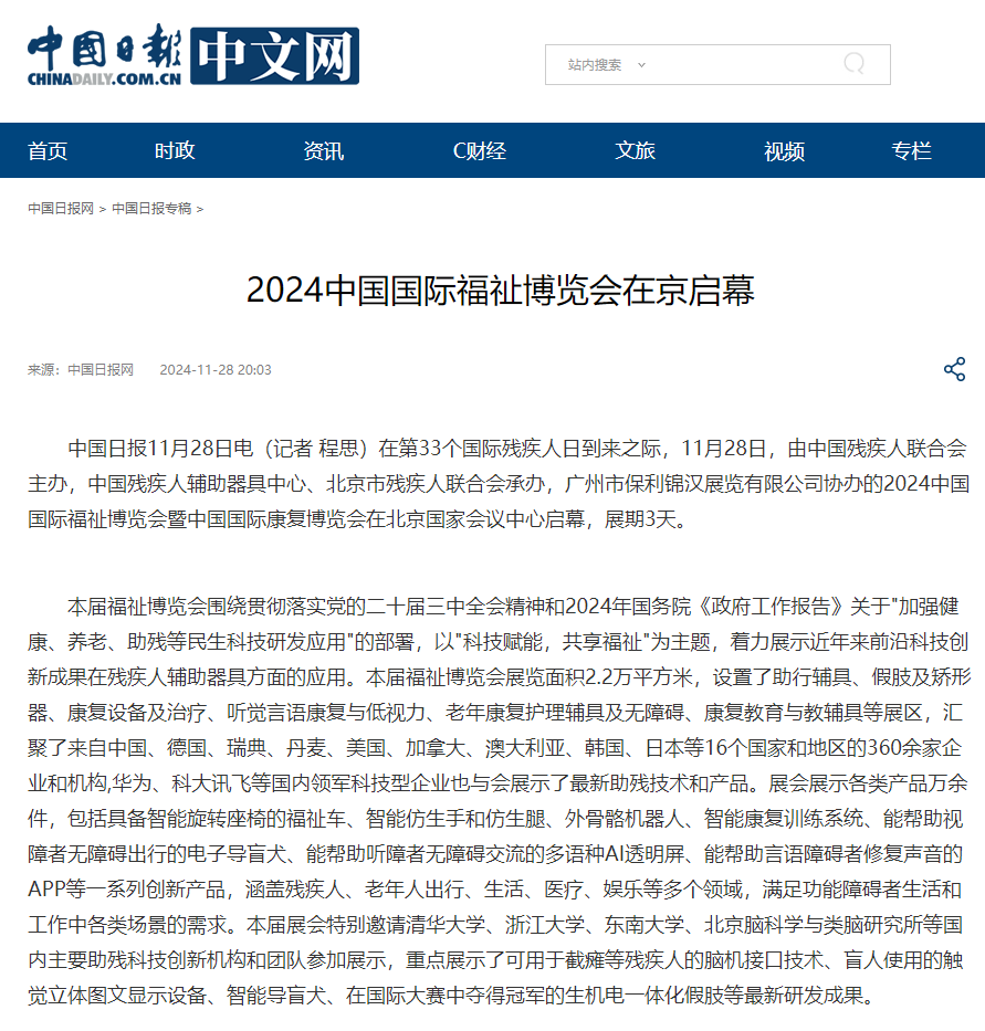本屆福祉博覽會(huì)圍繞貫徹落實(shí)黨的二十屆三中全會(huì)精神和2024年國務(wù)院《政府工作報(bào)告》關(guān)于"加強(qiáng)健康、養(yǎng)老、助殘等民生科技研發(fā)應(yīng)用"的部署,以"科技賦能,共享福祉"為主題,著力展示近年來前沿科技創(chuàng)新成果在殘疾人輔助器具方面的應(yīng)用。本屆福祉博覽會(huì)展覽面積2.2萬平方米,設(shè)置了助行輔具、假肢及矯形器、康復(fù)設(shè)備及治療、聽覺言語康復(fù)與低視力、老年康復(fù)護(hù)理輔具及無障礙、康復(fù)教育與教輔具等展區(qū),匯聚了來自中國、德國、瑞典、丹麥、美國、加拿大、澳大利亞、韓國、日本等16個(gè)國家和地區(qū)的360余家企業(yè)和機(jī)構(gòu),華為、科大訊飛等國內(nèi)領(lǐng)軍科技型企業(yè)也與會(huì)展示了最新助殘技術(shù)和產(chǎn)品。展會(huì)展示各類產(chǎn)品萬余件,包括具備智能旋轉(zhuǎn)座椅的福祉車、智能仿生手和仿生腿、外骨骼機(jī)器人、智能康復(fù)訓(xùn)練系統(tǒng)、能幫助視障者無障礙出行的電子導(dǎo)盲犬、能幫助聽障者無障礙交流的多語種AI透明屏、能幫助言語障礙者修復(fù)聲音的APP等一系列創(chuàng)新產(chǎn)品,涵蓋殘疾人、老年人出行、生活、醫(yī)療、娛樂等多個(gè)領(lǐng)域,滿足功能障礙者生活和工作中各類場(chǎng)景的需求。