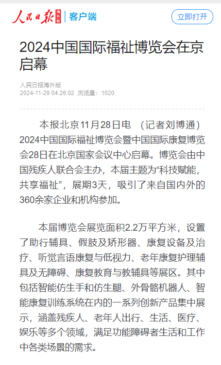 本報(bào)北京11月28日電 (記者劉博通)2024中國(guó)國(guó)際福祉博覽會(huì)暨中國(guó)國(guó)際康復(fù)博覽會(huì)28日在北京國(guó)家會(huì)議中心啟幕。博覽會(huì)由中國(guó)殘疾人聯(lián)合會(huì)主辦,本屆主題為“科技賦能,共享福祉”,展期3天,吸引了來(lái)自國(guó)內(nèi)外的360余家企業(yè)和機(jī)構(gòu)參加。
