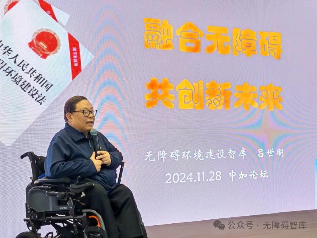 上圖為中國助殘志愿者協(xié)會會長呂世明作題為《融合無障礙 共創(chuàng)新未來》的主旨報告