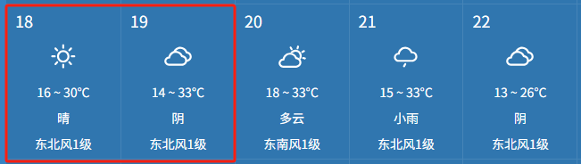 5月18日:晴,16-30℃,早晚溫差較大,建議采用“洋蔥式”穿衣法;