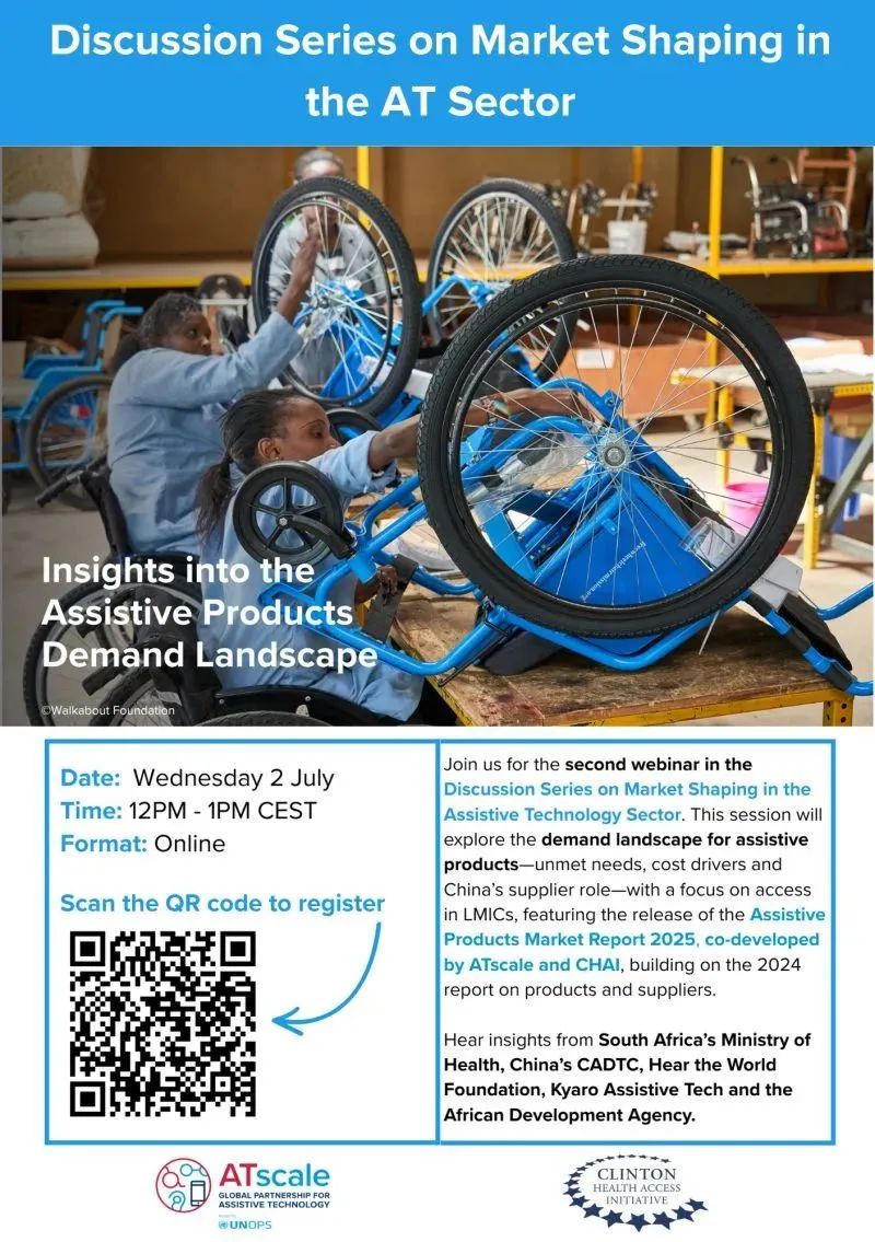 本次研討會(huì)還將正式發(fā)布由 ATscale 與 CHAI 共同編寫(xiě)的《輔助器具市場(chǎng)報(bào)告2025》(Assistive Products Market Report 2025),作為2024年報(bào)告的延續(xù),進(jìn)一步補(bǔ)充關(guān)于全球輔助器具市場(chǎng)需求與供應(yīng)的研究成果。并邀請(qǐng)來(lái)自南非衛(wèi)生部、中國(guó)殘疾人輔助器具中心(CADTC)、Hear the World 基金會(huì)、Kyaro Assistive Tech以及非洲發(fā)展機(jī)構(gòu)的嘉賓代表針對(duì)報(bào)告核心內(nèi)容與主題進(jìn)行發(fā)言。