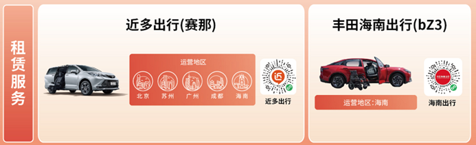 服務方面,為了能滿足消費者的臨時用車需求,自2024年5月開始,豐田中國聯(lián)合豐田金融旗下近多出行,逐步在北京、廣州、成都、蘇州,海南,開展賽那/格瑞維亞的福祉車租賃服務。只需登錄近多出行小程序或撥打客服熱線即可體驗。今年3月起,豐田海南出行也在海南推出了純電動bZ3福祉車的租賃服務。