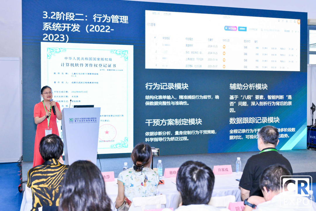 成都武侯特教學(xué)校的蔡曉莉校長(zhǎng)分享了“基于行為綜合干預(yù)模型的AI智能體的創(chuàng)建與應(yīng)用”,介紹了他們學(xué)?;谔厥饨逃龜?shù)字化轉(zhuǎn)型、人工智能技術(shù)應(yīng)用、行為干預(yù)理論體系的大背景下,特別是當(dāng)前行為分析工具不足、行為數(shù)據(jù)采集難題、傳統(tǒng)干預(yù)局限、缺乏系統(tǒng)化的數(shù)據(jù)分析平臺(tái)等行為干預(yù)痛點(diǎn)問(wèn)題,創(chuàng)建了適合武侯區(qū)的武侯特色的行為干預(yù)綜合模型,經(jīng)過(guò)六年的研究與實(shí)踐歷程,構(gòu)建了智能服務(wù)平臺(tái)、資源支持平臺(tái)、協(xié)同服務(wù)平臺(tái),并借助蔡曉莉名師工作室平臺(tái)開放共享。