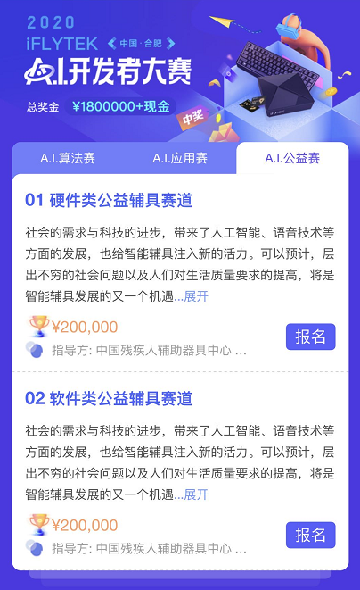 今年,在中國(guó)殘疾人輔助器具中心、中國(guó)聾人協(xié)會(huì)指導(dǎo),中國(guó)國(guó)際福祉博覽會(huì)暨中國(guó)國(guó)際康復(fù)博覽會(huì)組委會(huì)、深圳市信息無(wú)障礙研究會(huì)等多家單位聯(lián)合支持下,科大訊飛推出了A.I.公益賽,包含軟件類智能輔具賽題及硬件類智能輔具賽題。