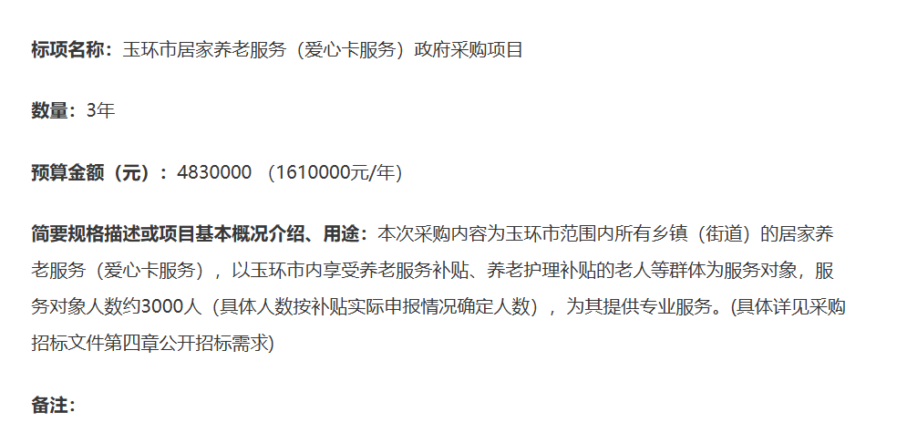 臺州邦元工程咨詢有限公司關于玉環(huán)市居家養(yǎng)老服務(愛心卡服務)政府采購項目的公開招標公告