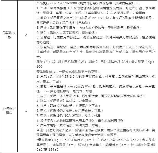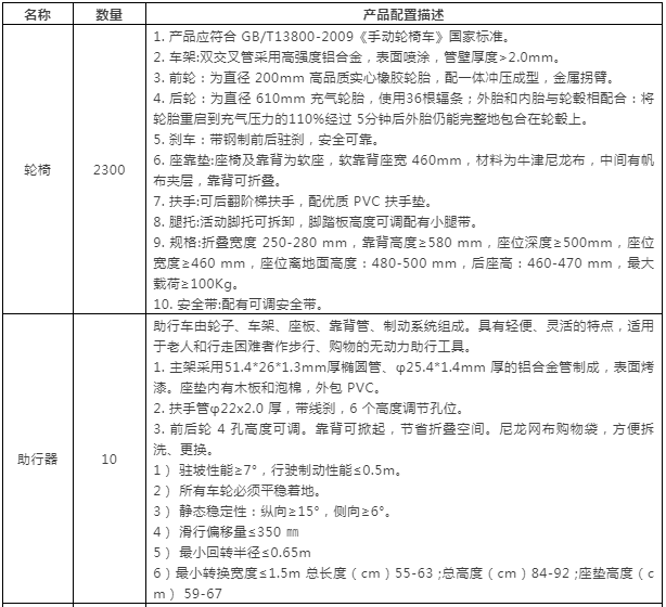 采購產(chǎn)品及數(shù)量:輪椅2300輛;助行器10個(gè);電動助行器2個(gè);多功能護(hù)理床1張。