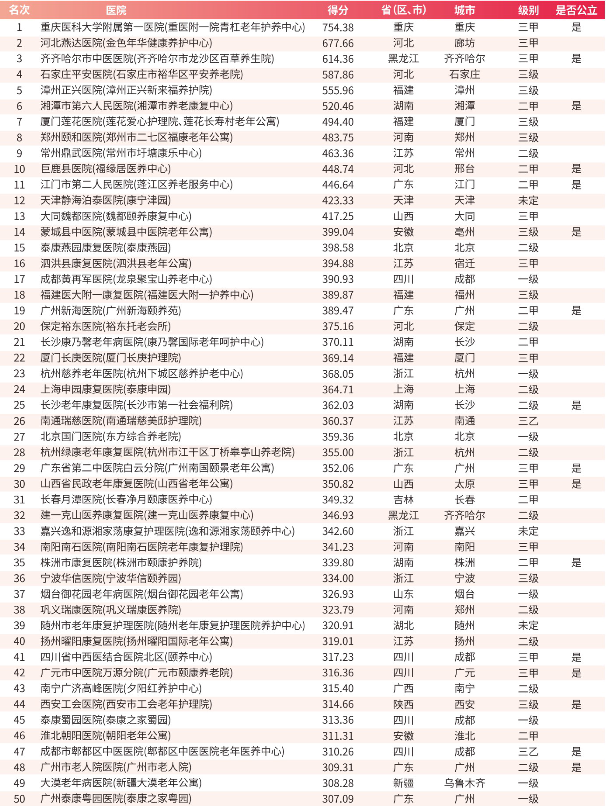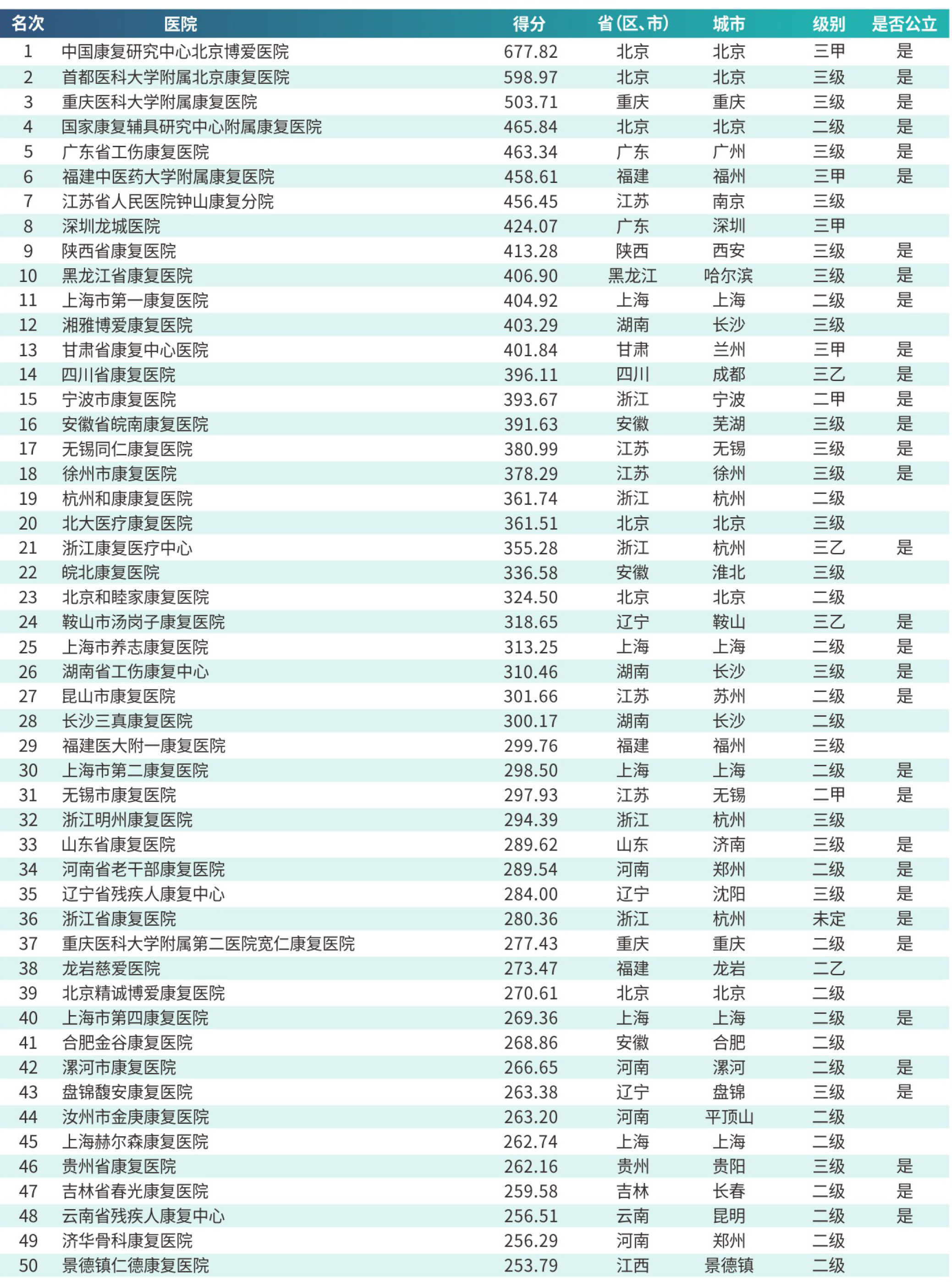 近年來,為應(yīng)對老齡化、慢病高發(fā)的態(tài)勢,我國制定和推出有關(guān)政策,鼓勵(lì)社會(huì)辦醫(yī)、推動(dòng)醫(yī)養(yǎng)結(jié)合和康復(fù)醫(yī)療的發(fā)展。日前,《中國醫(yī)院競爭力報(bào)告(2019~2020)》發(fā)布,其中包括2019康復(fù)醫(yī)院50強(qiáng)和醫(yī)養(yǎng)結(jié)合機(jī)構(gòu)100強(qiáng)。一起來看看都有哪些醫(yī)院和機(jī)構(gòu)上榜了: