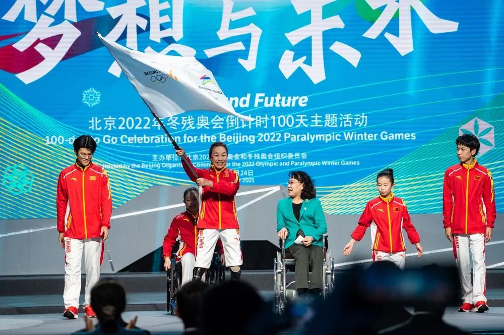 11月24日,北京2022年冬殘奧會(huì)倒計(jì)時(shí)100天主題活動(dòng)在北京舉行,中國殘聯(lián)主席張海迪(右三)為冬奧會(huì)和冬殘奧會(huì)賽會(huì)志愿者中的殘疾人代表授旗。新華社記者 陳鐘昊 攝