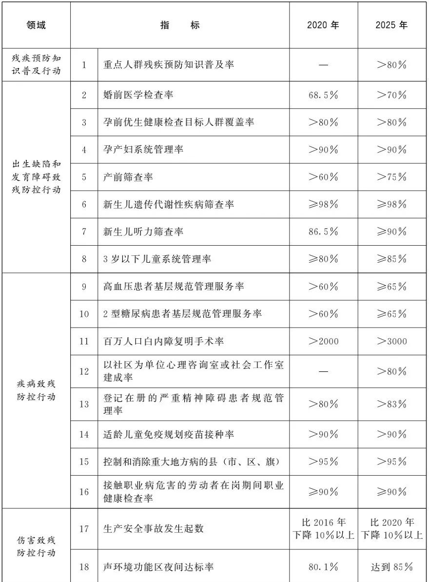 到2025年,覆蓋經(jīng)濟(jì)社會(huì)發(fā)展各領(lǐng)域的殘疾預(yù)防政策體系進(jìn)一步完善,全人群全生命周期殘疾預(yù)防服務(wù)網(wǎng)絡(luò)更加健全,全民殘疾預(yù)防素養(yǎng)明顯提升,遺傳和發(fā)育、疾病、傷害等主要致殘因素得到有效防控,殘疾康復(fù)服務(wù)狀況持續(xù)改善,殘疾預(yù)防主要指標(biāo)處于中高收入國(guó)家前列。