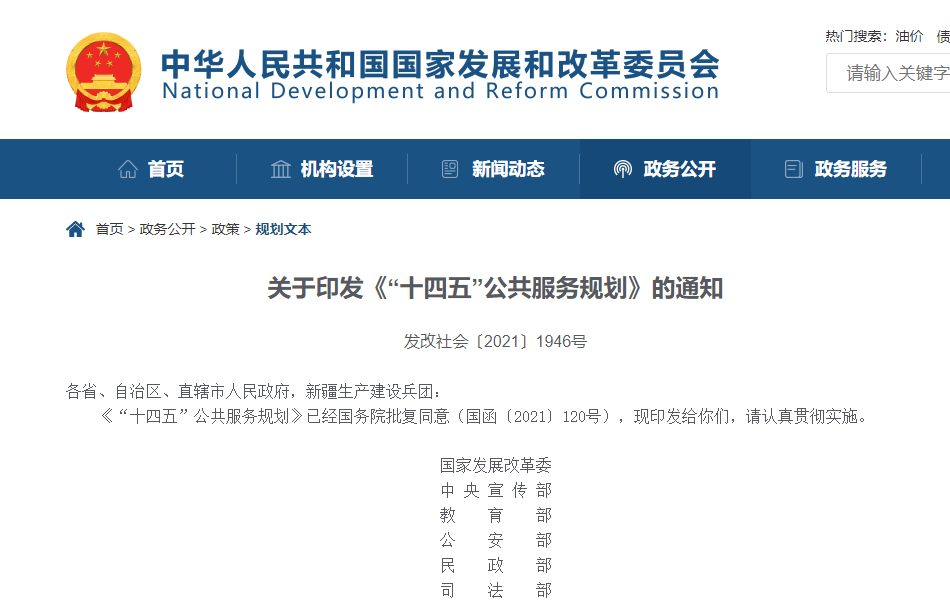 1月10日,國家發(fā)展和改革委員會發(fā)布關(guān)于《“十四五”公共服務(wù)規(guī)劃》的通知,此規(guī)劃依據(jù)《中華人民共和國國民經(jīng)濟(jì)和社會發(fā)展第十四個五年規(guī)劃綱要》編制,主要涵蓋幼有所育、學(xué)有所教、勞有所得、病有所醫(yī)、老有所養(yǎng)、住有所居、弱有所扶、優(yōu)軍服務(wù)保障和文體服務(wù)保障等領(lǐng)域的公共服務(wù)。
