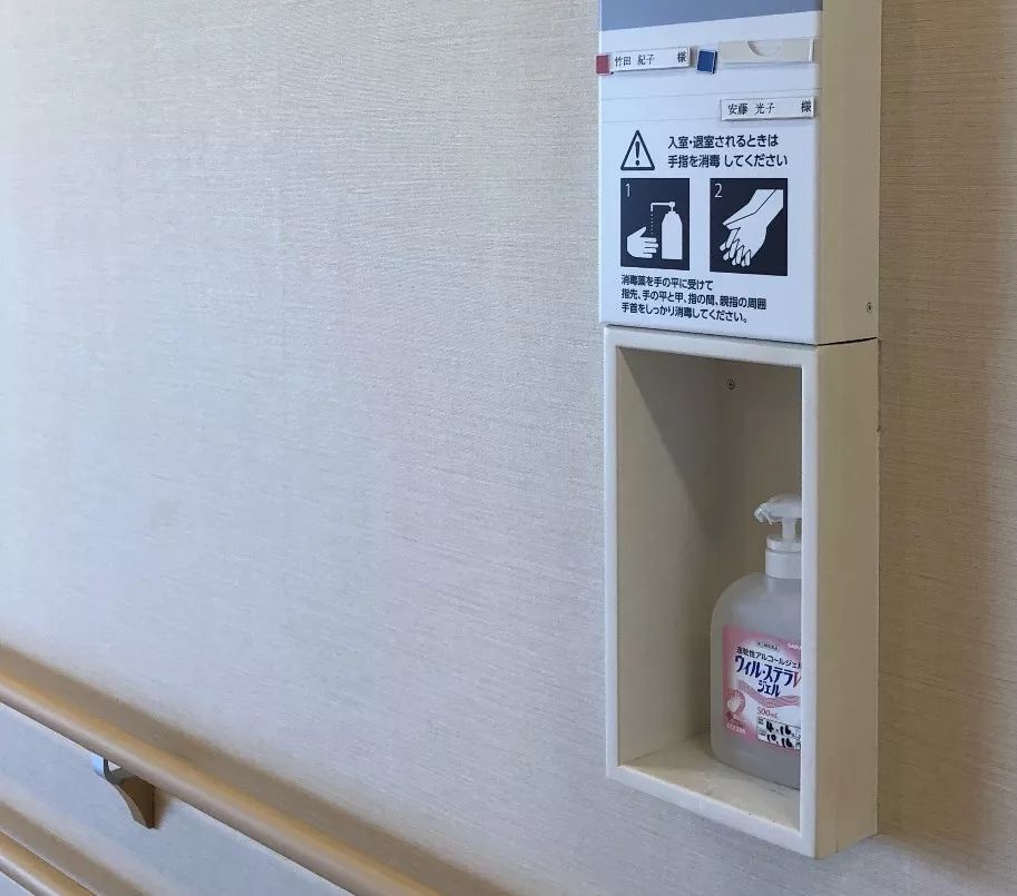 病房前的空間都配有洗手池,門牌下放置消毒液的小凹槽。由于固定的皂液機(jī)與墻面固定的位置沒(méi)法清洗,放這種瓶裝的似乎更為衛(wèi)生,添加消毒液時(shí)也更為方便。