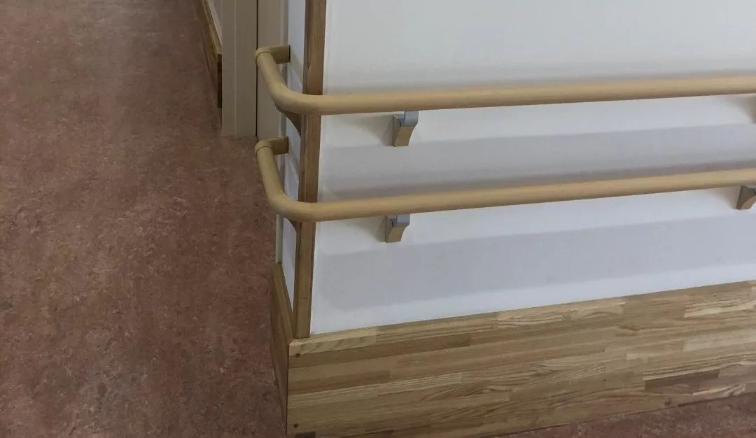 加高的實(shí)木防撞踢腳和雙高度扶手;扶手都包上了木色軟橡膠: