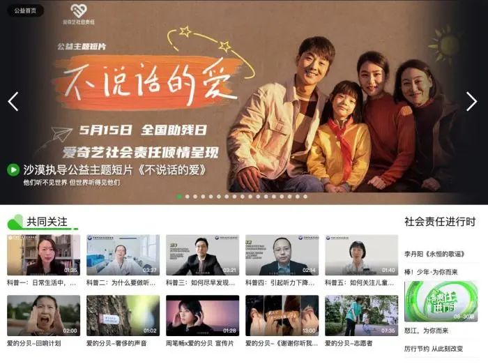 在全國助殘日當天,愛奇藝公益頻道傾情呈現(xiàn)公益主題短片《不說話的愛》,短片導演沙漠講述創(chuàng)作初衷,呼吁社會關(guān)心關(guān)愛聽障人群;同時更有蔣龍、蔣詩萌、駱明劼、周彥辰等17名愛奇藝明星志愿者聯(lián)合發(fā)出倡議,關(guān)注聽障群體,用愛溫暖無聲的世界。