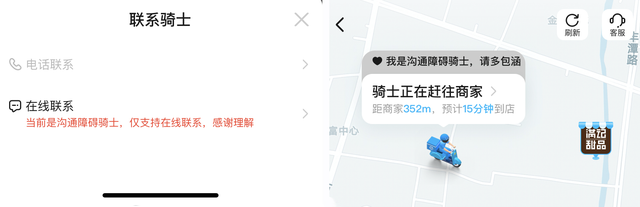 在獲得騎手授權(quán)后,餓了么App將向消費者提示當前配送騎手為聽障者。當消費者聯(lián)系騎手時,“電話”選項會默認關(guān)閉,系統(tǒng)將建議用戶消費者與騎手在線文字溝通。“該服務的核心是尊重騎手的意愿和隱私,只要騎手不主動設置,消費者看到的訂單頁面仍和普通騎手完全一致。”餓了么聽障騎手體驗負責人胡鹿強調(diào)。