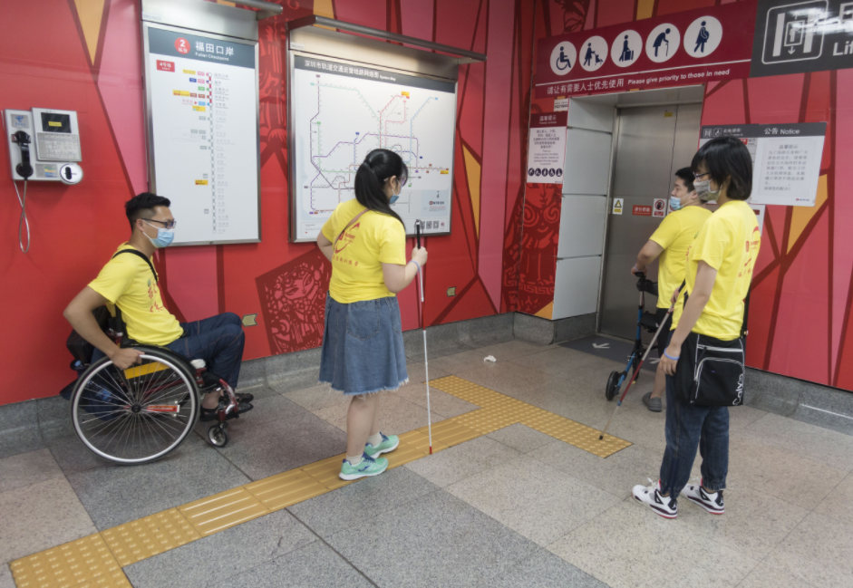 現(xiàn)如今在深圳,走進(jìn)任何一個地鐵站,映入眼簾的都是色澤鮮艷的黃色盲道,同時幾乎每個站點都設(shè)有無障礙電梯(垂直電梯),無障礙電梯出入口前設(shè)有無障礙通道供行動不便或持大件行李、推嬰兒車等乘客方便地進(jìn)出。