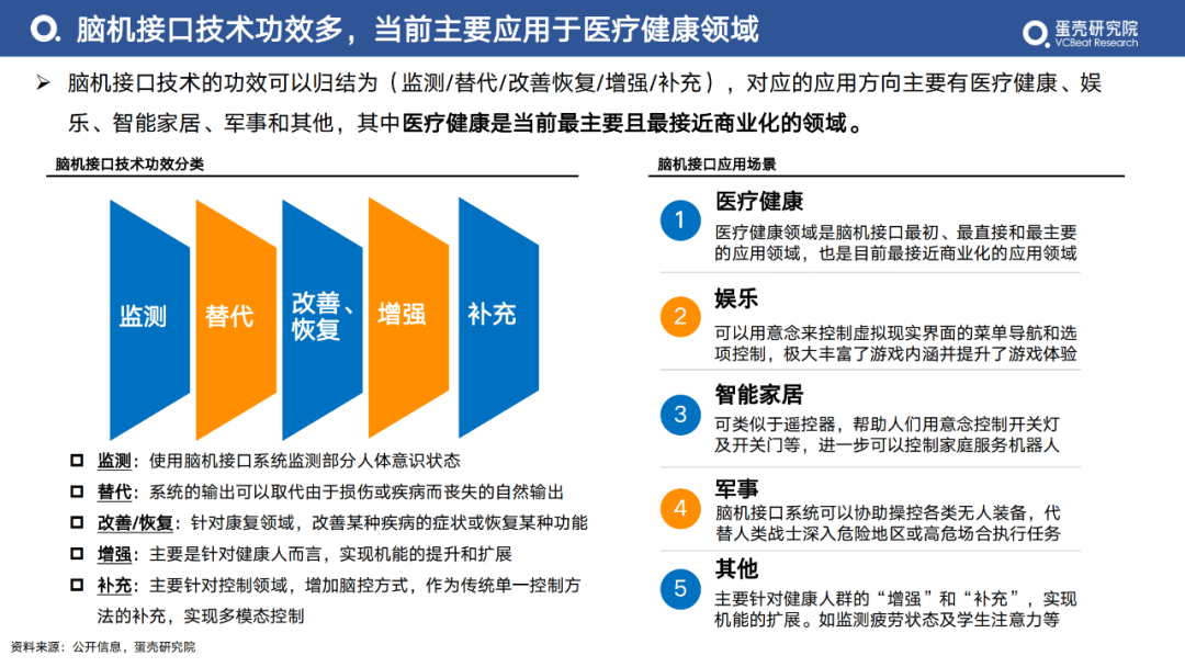 腦機(jī)接口技術(shù)的功效可以歸結(jié)為(監(jiān)測(cè)/替代/改善恢復(fù)/增強(qiáng)/補(bǔ)充),對(duì)應(yīng)的應(yīng)用方向主要有醫(yī)療健康、娛樂(lè)、智能家居、軍事和其他,其中醫(yī)療健康是當(dāng)前最主要且最接近商業(yè)化的領(lǐng)域。