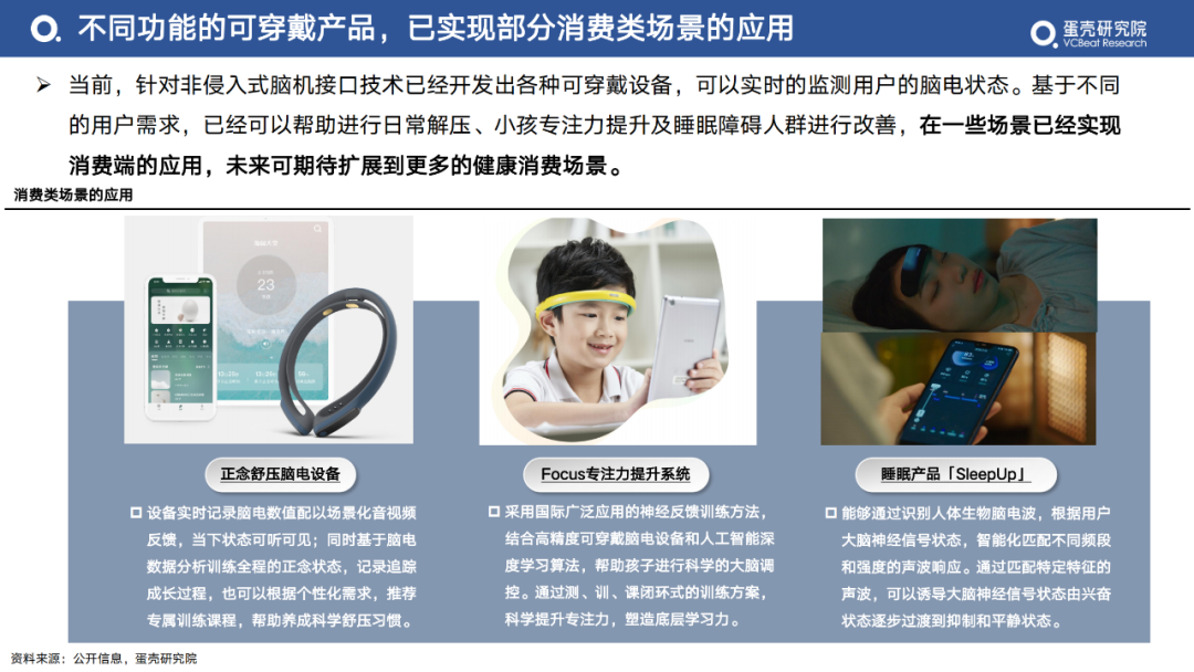 當(dāng)前,針對(duì)非侵入式腦機(jī)接口技術(shù)已經(jīng)開(kāi)發(fā)出各種可穿戴設(shè)備,可以實(shí)時(shí)的監(jiān)測(cè)用戶的腦電狀態(tài)。基于不同的用戶需求,已經(jīng)可以幫助進(jìn)行日常解壓、小孩專注力提升及睡眠障礙人群進(jìn)行改善,在一些場(chǎng)景已經(jīng)實(shí)現(xiàn)消費(fèi)端的應(yīng)用,未來(lái)可期待擴(kuò)展到更多的健康消費(fèi)場(chǎng)景。
