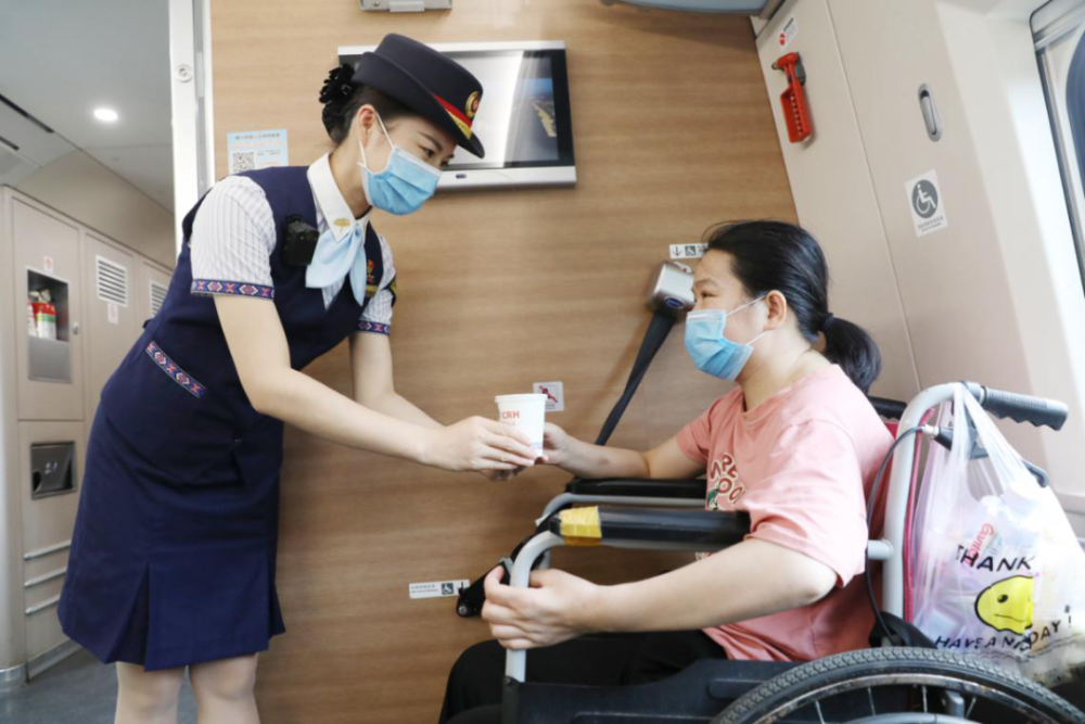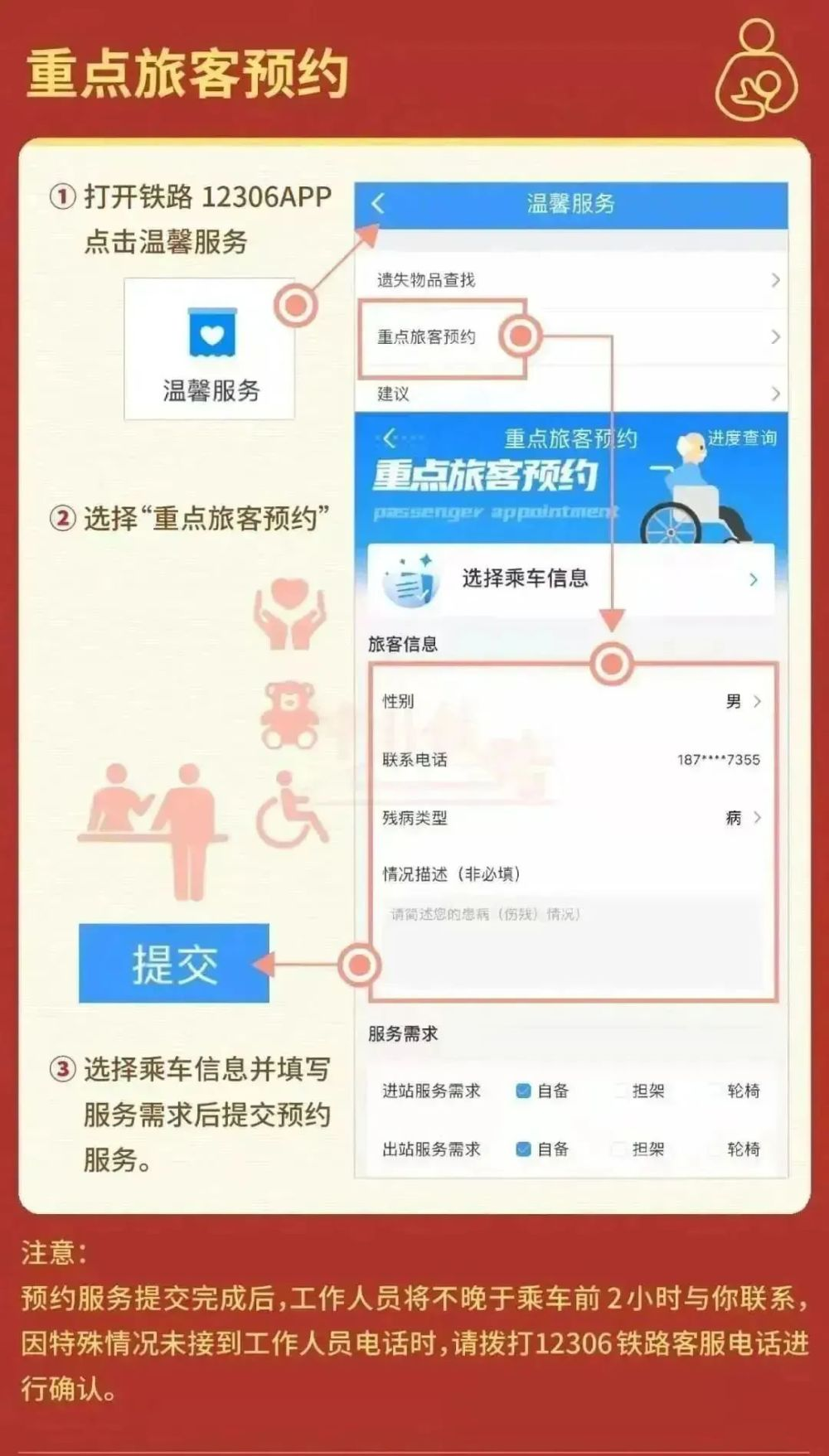 列車上為重點旅客提供專屬愛心服務(wù)。如遇其他問題,請隨時呼叫列車上的工作人員,他們會為有需要的旅客提供問詢解答、廣播尋醫(yī)、預(yù)約接站等貼心服務(wù),讓旅客出行更加美好。