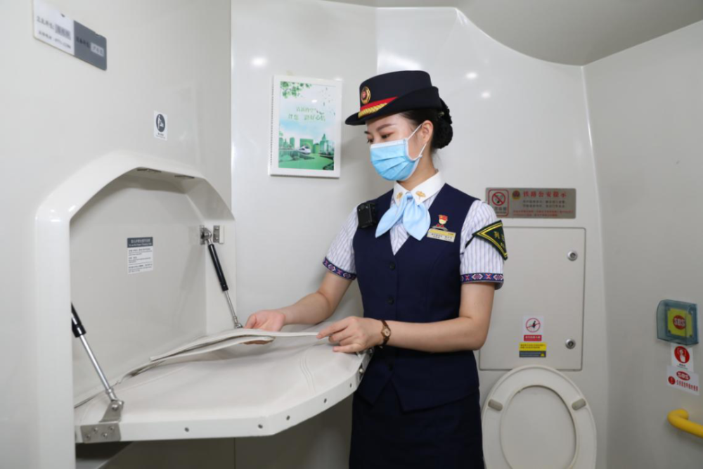 高鐵列車上設(shè)有無障礙衛(wèi)生間。配備安全扶手、SOS報警器等無障礙設(shè)施和母嬰護理臺,為重點旅客提供旅途便利。