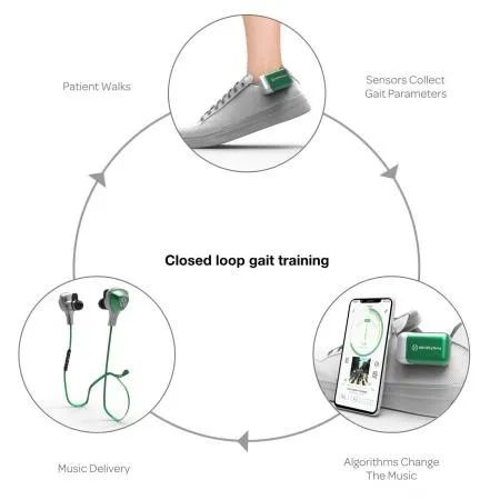 該數(shù)字療法的使用者需要將傳感器夾在鞋子上,戴上耳機即可開始與專業(yè)音樂治療師的視頻會話。傳感器收集患者的基線步態(tài)數(shù)據(jù),算法持續(xù)接收來自傳感器的實時數(shù)據(jù),根據(jù)用戶數(shù)據(jù)實施臨床干預措施?;颊呗犞魳冯S著節(jié)拍行走,算法不斷評估患者行走能力并提供聽覺刺激。除了數(shù)字療法外,MedRhythms還提供遠程的神經(jīng)音樂療法,主要面向腦損傷、阿爾茨海默癥、帕金森癥、發(fā)育障礙和多發(fā)性硬化癥,通過音樂療法幫助患者恢復語言、行動、認知等方面的能力。