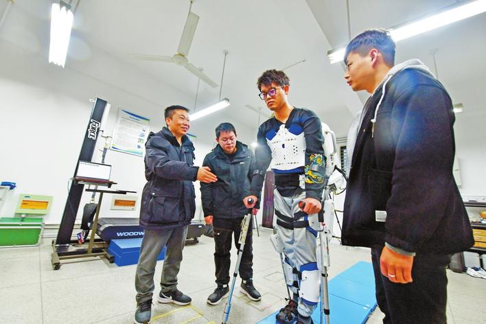 除了科普意義,安徽工程大學(xué)外骨骼機器人研發(fā)還不斷培養(yǎng)出更多人才。汪步云告訴記者,“我們產(chǎn)學(xué)研結(jié)合,下肢外骨骼機器人以及無人工業(yè)車輛領(lǐng)域的研究吸引了越來越多的年輕人到我們學(xué)校,這些年我們也的確培養(yǎng)了不少人才,他們中有相當(dāng)高的比例又就業(yè)于蕪湖本地的機器人、人工智能等戰(zhàn)新產(chǎn)業(yè),大家熟悉的‘扭扭車男孩’在進入我校后也對該項目感興趣,目前也在學(xué)習(xí)這方面知識,他希望通過學(xué)習(xí)有一天也為自己制造一臺,實現(xiàn)自由行走的夢想”。