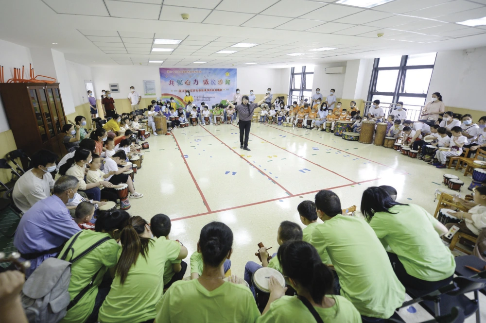 每次鼓聲響起,現(xiàn)場充滿溫馨與激情,孩子們敲打著手中的小鼓,跟著節(jié)奏賣力演奏;家長們守護(hù)著身前的小孩,聽著指揮全心配合。“3、2、1,收!”指令一出,全場寂靜;“1、2,一起來!”隨即又是鼓聲激昂,逐漸氣勢澎湃……踩著鼓點(diǎn),孩子和家長們一起敲散了生活的陰霾,敲響對美好未來的熱愛。