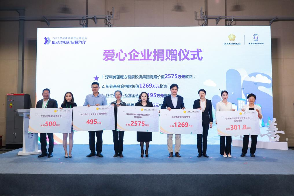 (上三圖為可孚醫(yī)療科技股份有限公司、新矩基金會(huì)、深圳美麗魔方健康投資集團(tuán)、浙江螞蟻公益基金會(huì)、正保遠(yuǎn)程教育、寶泰歐(北京)假肢矯形器商業(yè)有限責(zé)任公司、上海頌協(xié)醫(yī)療器械有限公司、如新集團(tuán)、浙江諾爾康神經(jīng)電子科技股份有限公司、亞瑞科爾國際廣告?zhèn)髅剑ū本┯邢薰?、大王(南通)生活用品有限公司、杭州愛聽科技有限公司、明門(中國)幼童用品有限公司、唐山市福愛假肢矯形器有限公司、北京創(chuàng)潔衛(wèi)康科技有限公司等15家愛心企業(yè)和機(jī)構(gòu)向中國殘疾人福利基金會(huì)捐贈(zèng)了總價(jià)值1.07億元的款物)