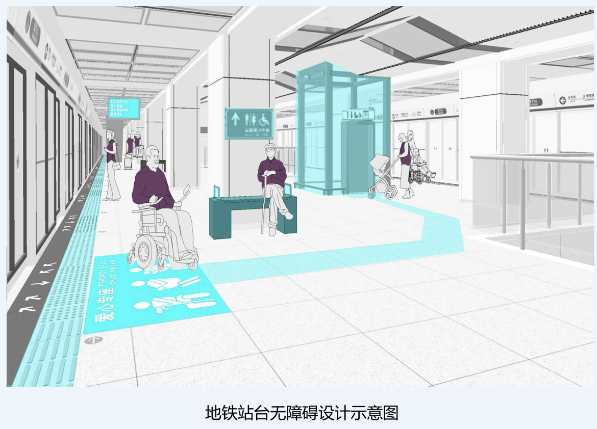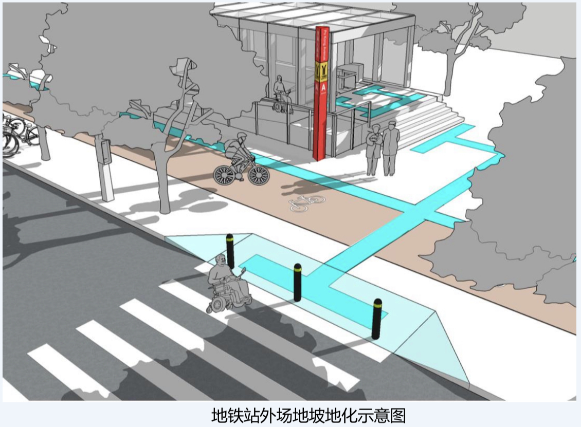 《規(guī)劃》要求,梳理有條件改造的地鐵站點無障礙設(shè)施,2025年前完成有條件改造設(shè)施總量的80%。地鐵站的出入口(有無障礙設(shè)計要求的)應(yīng)為無障礙出入口,地面宜為平坡地形。地鐵站內(nèi)外應(yīng)規(guī)劃設(shè)置行進盲道和提示盲道系統(tǒng),其盲道系統(tǒng)應(yīng)與站臺層的無障礙電梯和出入口直接相連,與周邊公交站點、平面和立體過街設(shè)施、停車場所、出租車??课弧⒔ㄖ鋈肟?、周邊配套商業(yè)服務(wù)設(shè)施等相連,并應(yīng)在主要通行節(jié)點設(shè)置盲文標(biāo)識或電子標(biāo)簽等智能導(dǎo)示設(shè)施。