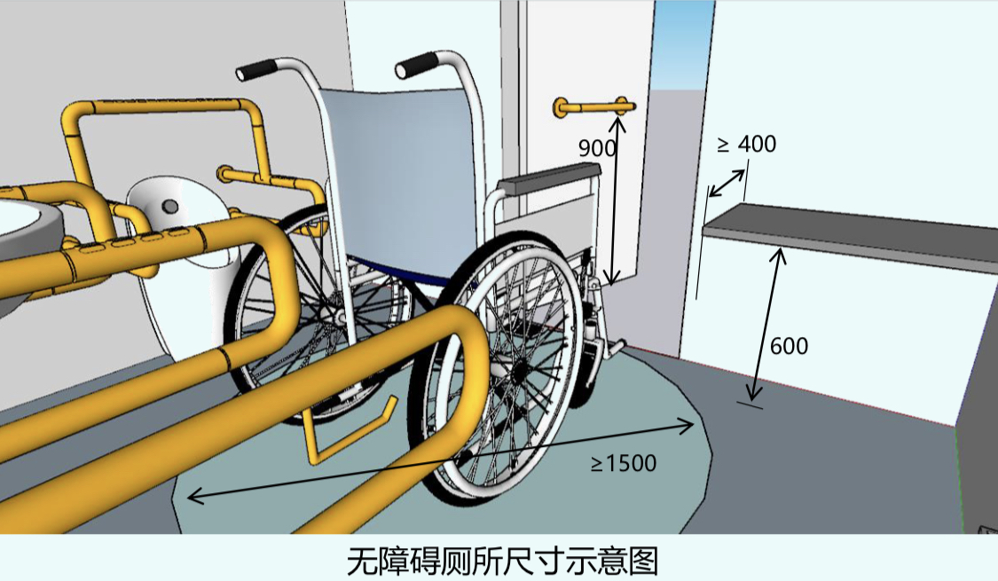 《規(guī)劃》明確,無障礙廁所位置應(yīng)靠近公共衛(wèi)生間(廁所),面積不應(yīng)小于4.00㎡,內(nèi)部應(yīng)留有直徑不小于1.50m的輪椅回轉(zhuǎn)空間,內(nèi)部應(yīng)設(shè)置無障礙坐便器、無障礙洗手盆、多功能臺、低位掛衣鉤和救助呼叫裝置,應(yīng)設(shè)置水平滑動式門或向外開啟的平開門。