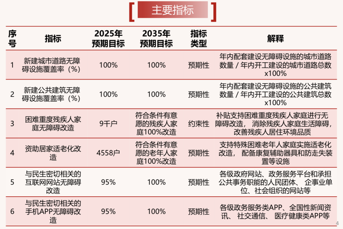 《規(guī)劃》明確了主要指標(biāo):新建城市道路無障礙設(shè)施覆蓋率、新建公共建筑無障礙設(shè)施覆蓋率在2025年達(dá)到100%;困難重度殘疾人家庭無障礙改造,2025年預(yù)期目標(biāo)為9千戶,2035年符合條件有意愿的殘疾人家庭100%改造;資助居家適老化改造,2025年預(yù)期目標(biāo)4558戶,2035年符合條件有意愿的老年人家庭100%改造。