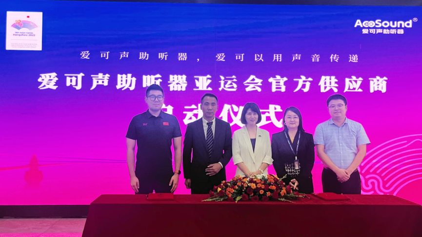 2022年第19屆亞運(yùn)會(huì)組委會(huì)副部長(zhǎng)葉虹、2022年第19屆亞運(yùn)會(huì)組委會(huì)市場(chǎng)開(kāi)發(fā)部委員陳尚、杭州愛(ài)聽(tīng)科技有限公司董事長(zhǎng)李鵬、杭州愛(ài)聽(tīng)科技有限公司總經(jīng)理姚秀萍、杭州路遙私募基金管理有限公司總裁姜受成等領(lǐng)導(dǎo)受邀出席本次儀式。浙江電視臺(tái)媒體記者、愛(ài)可聲助聽(tīng)器團(tuán)隊(duì)成員等見(jiàn)證了這一重要時(shí)刻。