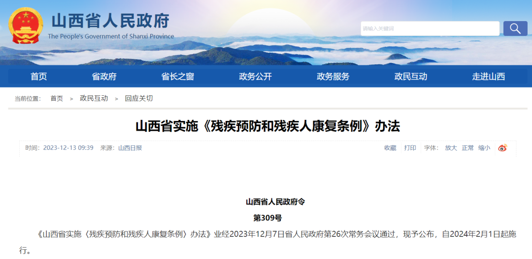 山西省實(shí)施《殘疾預(yù)防和殘疾人康復(fù)條例》辦法2月1日起施行