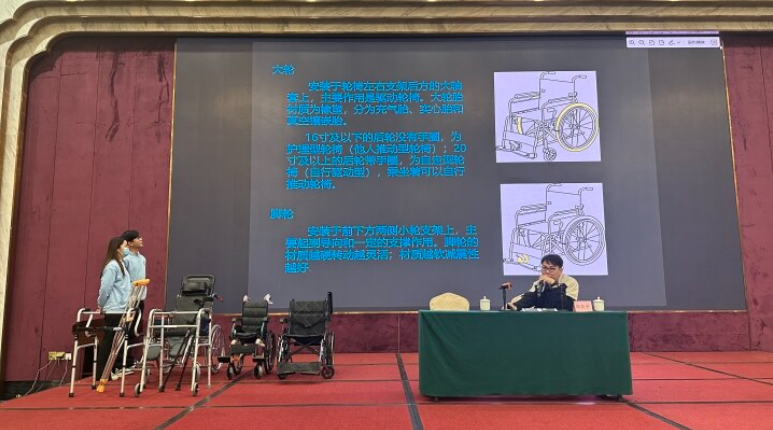 授課專家講解輪椅等輔具的特點(diǎn)。