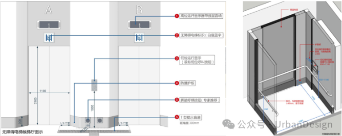 “創(chuàng)新核“建筑群內(nèi)部客梯共計 8 組 11 部 ,提高標準全部設(shè)置為無障礙電梯(圖 12),方便所有人使用,避免區(qū)別對待。電梯口采用八字口,轉(zhuǎn)角進行圓角設(shè)計,避免磕碰危險。候梯廳設(shè)置低位呼梯按鈕、提示盲道、運行顯示裝置等,并增設(shè)腳踏按鈕。轎廂內(nèi)設(shè)置低位操作盤、盲文按鍵、三面扶手、鏡面材質(zhì)、報層音響、聲光顯示裝置等。