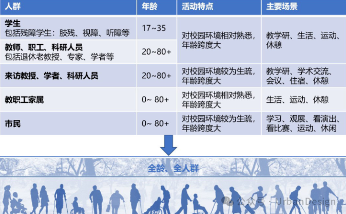 包容性校園的服務對象不再是少數(shù)殘障或運動損傷學生,而是擴展到全體在校師生及工作人員,以及來往于校園的專家學者、研究人員及普通市民,即面向全體社會成員,年齡覆蓋全齡(圖 1)。因此,校園環(huán)境在解決殘障群體需求的基礎(chǔ)上,在空間規(guī)劃和設(shè)施供給中,需要考慮校園內(nèi)各類人群學習、工作、生活需求及不同的體能特征和認知能力,提供多種可供選擇的通行、使用、交互和服務的方式。