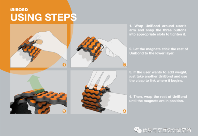 UniBond是一款適合手臂和手部截肢者的健身配重帶。無法雙手同時握住啞鈴的人,在UniBond的幫助下,仍然可以方便、輕松地進(jìn)行均衡鍛煉。用戶可以用他/她有能力的手將它纏繞在另一個人的手腕上,然后卡扣和磁鐵使其保持緊密和穩(wěn)定。此外,外觀設(shè)計和明亮清新的色彩選擇給人以力量和活力的感覺,鼓勵用戶進(jìn)行鍛煉。