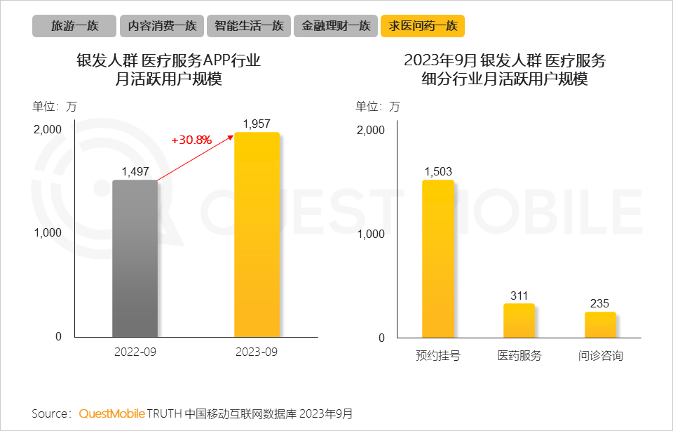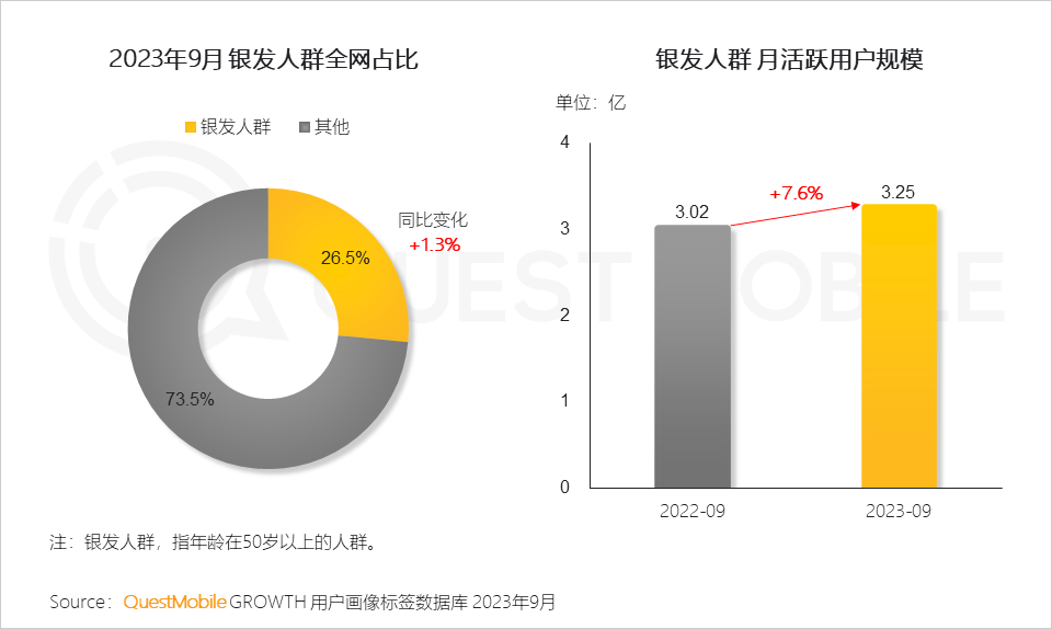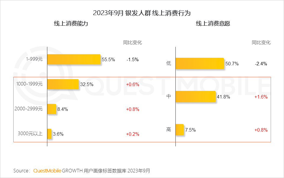 QuestMobile數(shù)據(jù)顯示,截止到2023年9月,銀發(fā)人群用戶規(guī)模已達(dá)到3.25億,同比增長了7.6%;全網(wǎng)占比已經(jīng)達(dá)到26.5%,同比提高了1.3個百分點(diǎn)。同時,銀發(fā)群體線上消費(fèi)能力、消費(fèi)意愿也在提升,9月份,銀發(fā)人群千元以上消費(fèi)能力占比較去年同期增加了1.6%,中高端消費(fèi)意愿占比較去年同期增加了2.4%。銀發(fā)經(jīng)濟(jì)消費(fèi)潛力如何挖掘?不妨看報告吧。