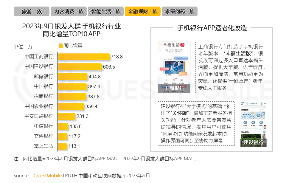 9、移動支付方面,各大國有及股份制銀行加快完成適老化進(jìn)程,各手機(jī)銀行APP紛紛開發(fā)出適合老年群體的專屬界面,為銀發(fā)人群辦理金融業(yè)務(wù)提供更好的體驗(yàn),進(jìn)而進(jìn)一步獲得用戶擁躉。