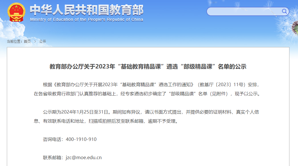 1月25日,教育部發(fā)布2023年“基礎(chǔ)教育精品課”遴選“部級(jí)精品課”名單公示,公示期為2024年1月25日至31日。本屆活動(dòng)全國(guó)共有6萬(wàn)多所學(xué)校的22萬(wàn)余名教師報(bào)名參與,通過(guò)教師自主申報(bào)、學(xué)校推薦、縣級(jí)初選、市省遴選等程序,各?。ㄗ灾螀^(qū)、直轄市)共推薦特殊教育精品課499節(jié)。在此基礎(chǔ)上,教育部組織專(zhuān)家從目標(biāo)內(nèi)容、教學(xué)過(guò)程、教學(xué)資源、技術(shù)規(guī)范等方面對(duì)推薦精品課進(jìn)行評(píng)審,最終公示了特殊教育類(lèi)170節(jié)。