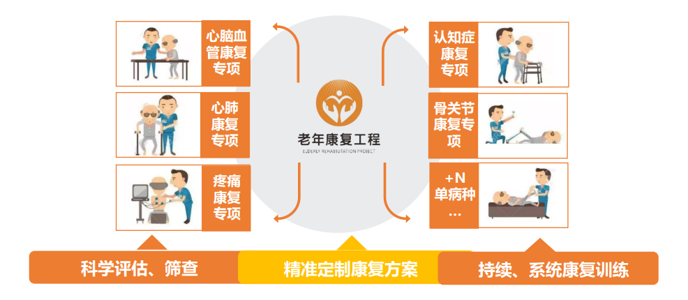 老年康復(fù)工程的主要康復(fù)專項(xiàng),是依托優(yōu)質(zhì)康復(fù)資源,以模塊化的單病種康復(fù)服務(wù)體系,賦能給養(yǎng)老服務(wù)機(jī)構(gòu)——給規(guī)劃、給運(yùn)營(yíng)體系、給培訓(xùn)輔導(dǎo)、給增值產(chǎn)品。