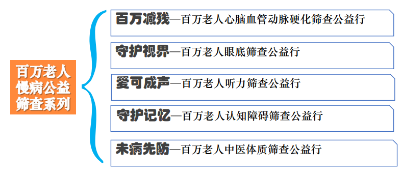 老年康復(fù)工程已推出了多個(gè)“百萬(wàn)老人慢病公益篩查”系列活動(dòng),項(xiàng)目主要圍繞老年人常見(jiàn)慢病,用優(yōu)質(zhì)資源和品牌項(xiàng)目,開(kāi)展公益活動(dòng);通過(guò)公益活動(dòng),進(jìn)行市場(chǎng)推廣和培育,轉(zhuǎn)化自費(fèi)用戶;發(fā)揮基金會(huì)的公募優(yōu)勢(shì),以公益活動(dòng)帶動(dòng)社會(huì)資金籌措,反哺于自身業(yè)務(wù)。