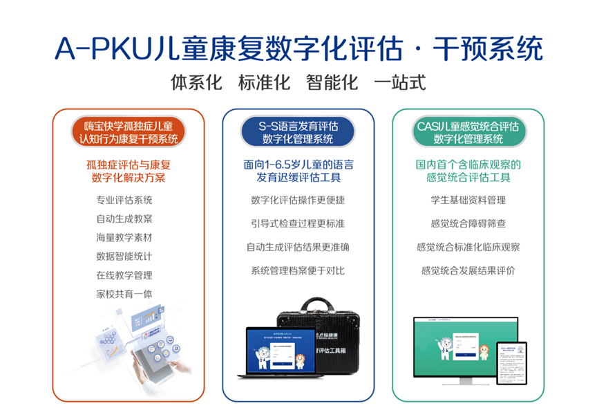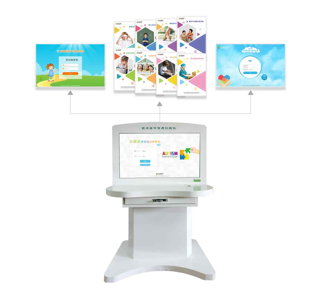 孤獨(dú)癥評估與康復(fù)系統(tǒng)由數(shù)字康復(fù)管理平臺(醫(yī)療級推車)及多臺康復(fù)終端設(shè)備組成,適用于孤獨(dú)癥譜系障礙及相關(guān)發(fā)育障礙患者的篩查、評估和康復(fù)治療。本系統(tǒng)搭載了一系列專業(yè)的篩查評估工具,創(chuàng)新性地采用“基于測評結(jié)果智能匹配個別化康復(fù)計劃”的解決方案,契合并滿足了高效評估、臨床康復(fù)、居家訓(xùn)練、康復(fù)管理等場景的需求,切實(shí)提升了康復(fù)服務(wù)的效率和效果。