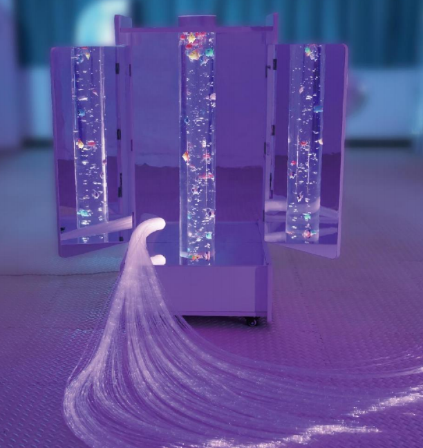 這款感官統(tǒng)合產(chǎn)品是專為兒童設(shè)計的,尤其適用于自閉癥和失語癥患者,外觀是一個可移動雙開門的柜子,產(chǎn)品內(nèi)部左右和底部設(shè)有鏡子,還有一根透明的亞克力柱,可產(chǎn)生多種七彩變光效果,并產(chǎn)生大量細(xì)小而均勻的氣泡,這些氣泡通過氣泡水柱上升,帶來微小的觸覺刺激,幫助放松身心,有一堆的光纖由柜子里面延伸而出,能隨著氣泡柱的變化而變化七彩顏色。坐在光纖氣泡柜旁邊,專注于觀察和感受水柱的運(yùn)動氣泡的觸感和七彩變光的美感,對于自閉癥和失語癥患者,這個過程可以激發(fā)他們的感官注意力、幫助他們表達(dá)情感,并促進(jìn)社交互動。