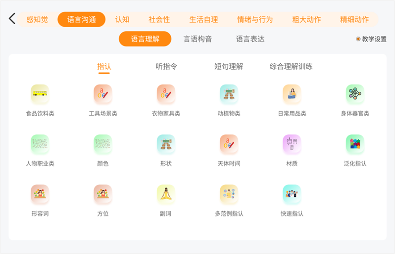 自閉癥評估與訓(xùn)練儀集多種國內(nèi)外權(quán)威專業(yè)的評估工具,并配套相應(yīng)的評估手冊和操作道具,同時和后續(xù)的訓(xùn)練及個別教育計劃內(nèi)容啟動關(guān)聯(lián),可根據(jù)評估結(jié)果開展針對性訓(xùn)練。該系統(tǒng)包括社會交往、認(rèn)知訓(xùn)練、語言溝通、感知覺、職業(yè)能力等八大維度的訓(xùn)練內(nèi)容,涵蓋了數(shù)十個完全不同的個性化訓(xùn)練目標(biāo)。