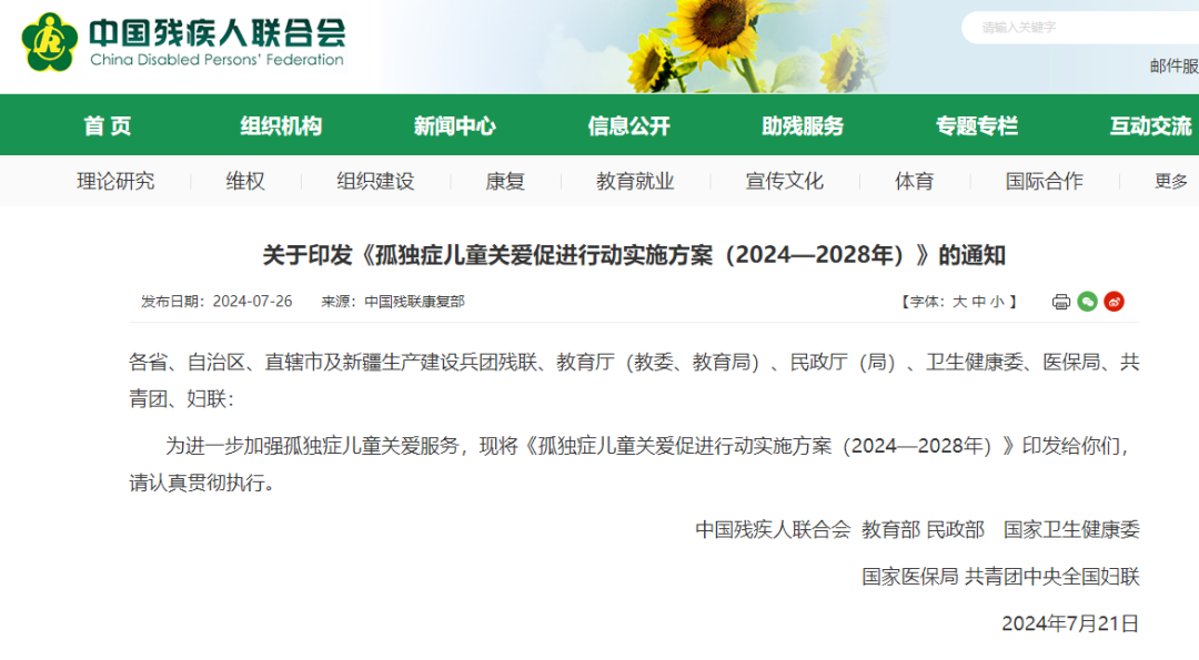 中國殘聯(lián),印發(fā)《孤獨(dú)癥兒童關(guān)愛促進(jìn)行動(dòng)實(shí)施方案(2024-2028年)》https://www.cdpf.org.cn/zwgk/zcwj/wjfb/e9e23982df5248e3b0d82d180c368996.htm