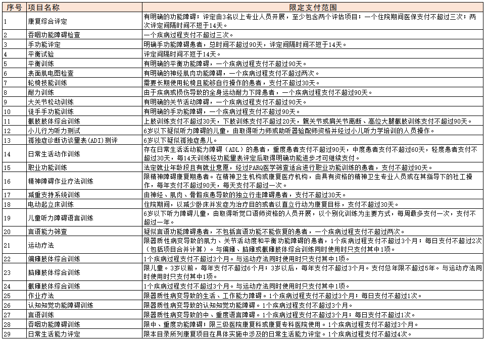 而醫(yī)療保障方面,根據(jù)“衛(wèi)農(nóng)衛(wèi)發(fā)〔2010〕80號(hào)”和“人社部發(fā)〔2016〕23號(hào)”兩個(gè)文件,目前一共有29項(xiàng)醫(yī)療康復(fù)項(xiàng)目納入基本醫(yī)療保險(xiǎn)支付范圍。